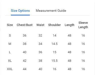 - XXL (Bust Size: 44 in, Length: 50 in)